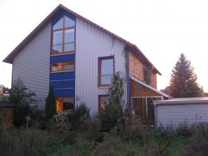 Ansicht von Süden, Holzhaus komplett unterkellert, Keller ist vom Wohnhaus thermisch getrennt, Solarthermieanlage auf dem Dach für Heizung und Trinkwarmwasser, Passivhausfenster, Außenwändewände gedämmt mit Isoflock, Zentrale Lüftungsanlage mit Wärmerückgewinnung.